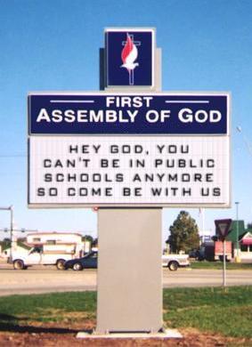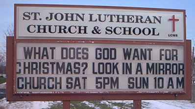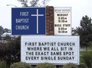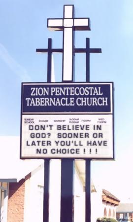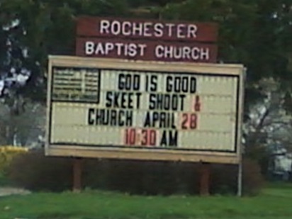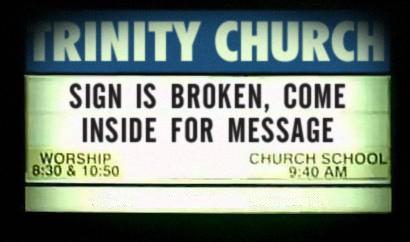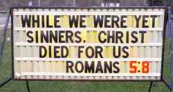 ![]() He didn't just die for us Romans, He died for everybody! | ![]() OK People, let's get to church so they can fix their sign! |